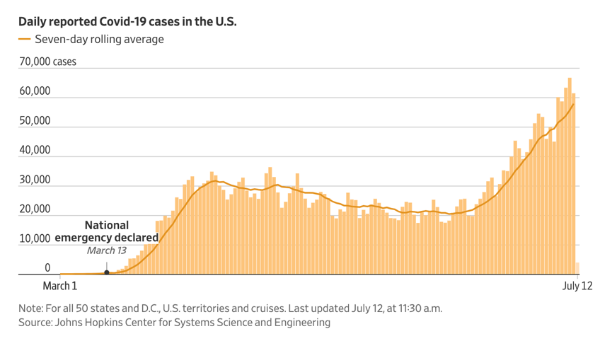 △3月1日至6月12日期间美国每日新增确诊病例数(来源:《华尔街日报》)